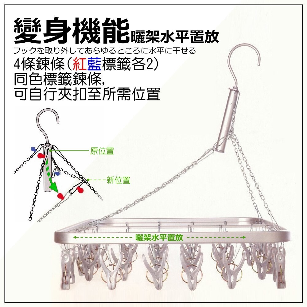 ■ 曬架掛軸以鍊條設計,可依吊掛場所,調整鍊條掛軸端的掛勾,以保持曬架水平置放