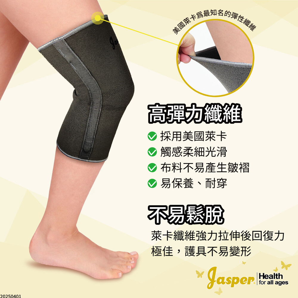 • 萊卡彈性底紗每一公分皆纏以尼龍繞12~16圈,抗氧化,讓護膝彈性壽命延長數年。