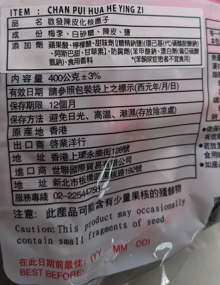 1. 品名:香港 啟發 陳皮化核應子 400公克/包
