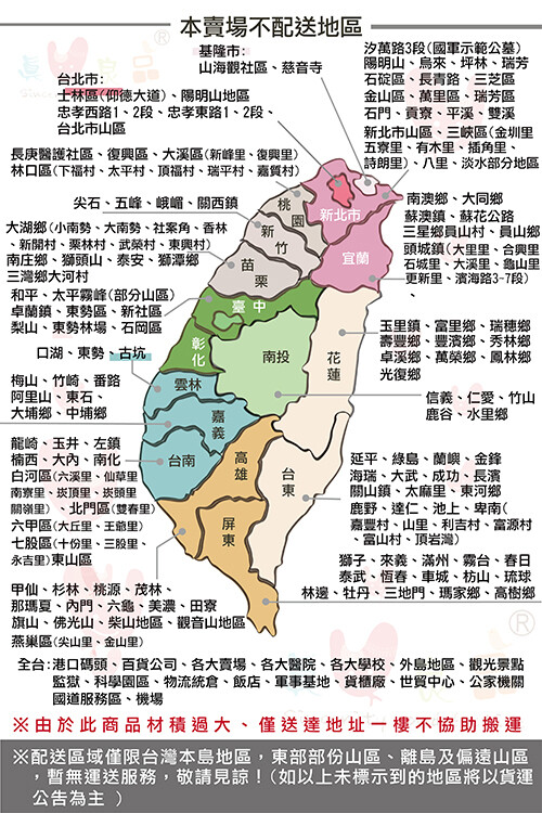 ※偏遠地區、山區、部份公司行號(力晶科技、鉅晶、矽導、友達、聯電、聯合大樓、啟基、台積電、鴻海科技、緯創科技、久元電子、旺宏電子、工業技術研究院、精材科技、台塑相關企業)、大賣場、有館內物流的百貨公司、購物中心、倉儲統倉、監獄、看守所、貨櫃場、進出口碼頭、軍用碼頭,暫無運送服務,敬請見諒;如有貨運配送困難之地區,我司將保留訂單出貨權利,謝謝。