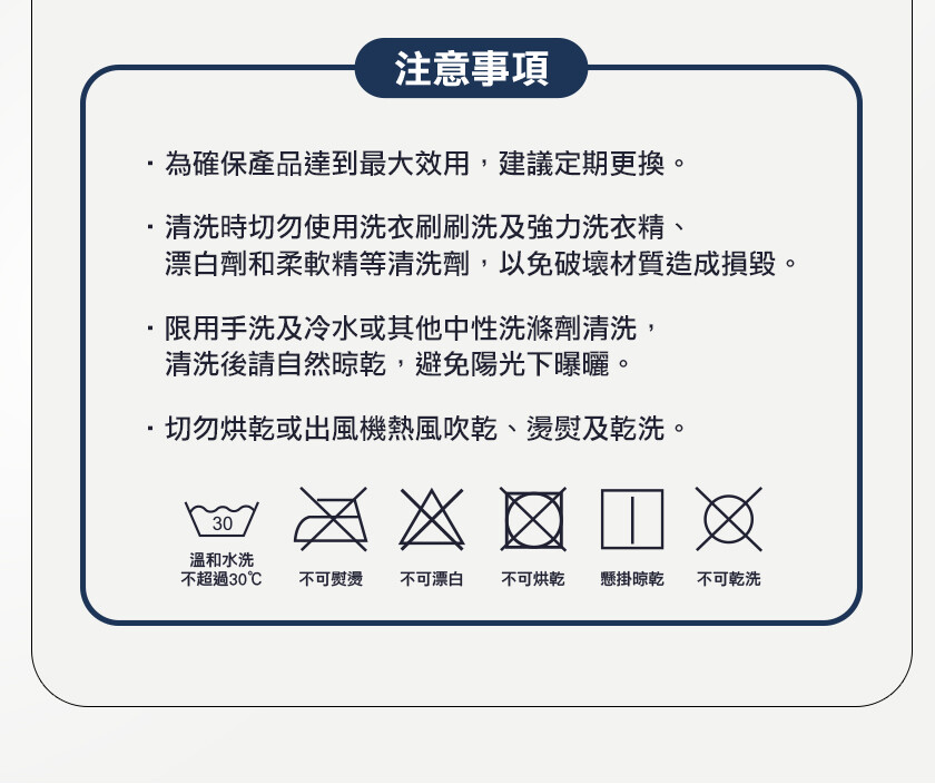 •限用手洗及冷水或其他中性洗滌劑清洗,清洗後請自然晾乾,避免陽光下曝曬