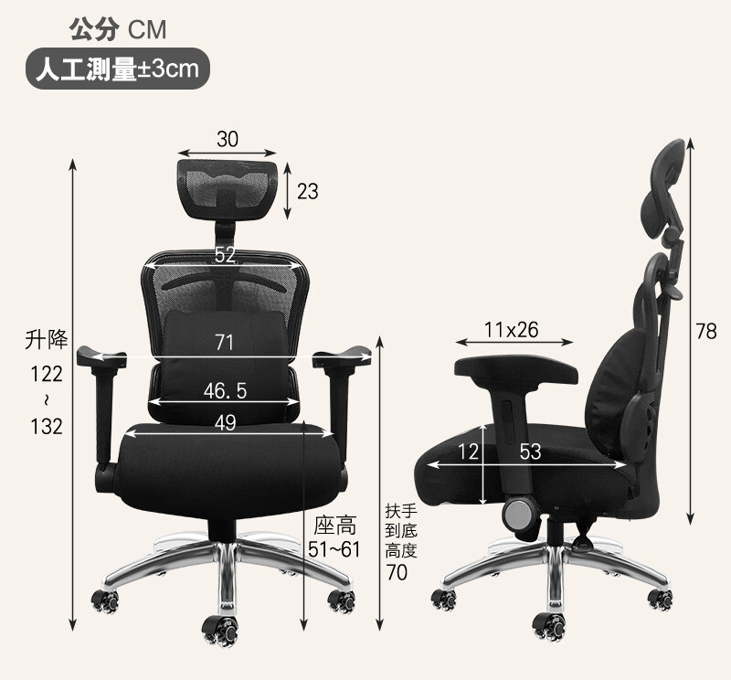 材質:彈性透氣網布、PU扶手、塑膠