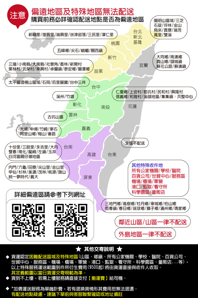 ◆貨運認定之困難配送區域(山區、鄉鎮、所有公家機關、學校、醫院、百貨公司、世貿中心、服務區),不做配送;貨下一樓,不做上樓層等附加運送。"有配送地點疑慮,建議下單前與客服聯繫確認"