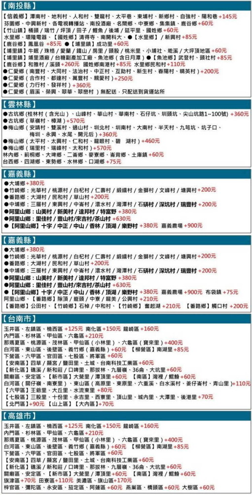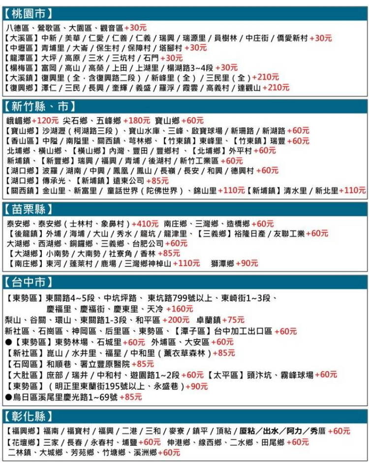 1.以上需加收運費區域皆以合作貨運公司為主,如需加收聯運費,會於出貨前聯繫消費者。