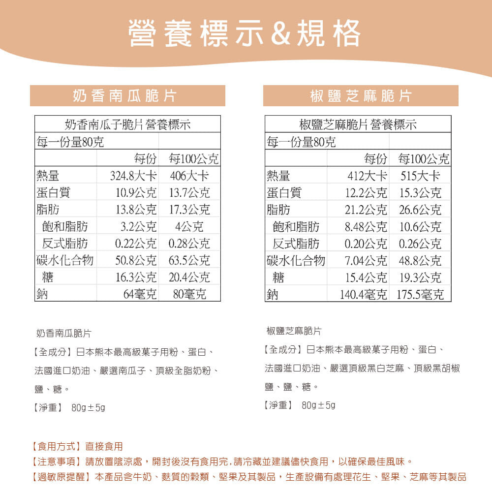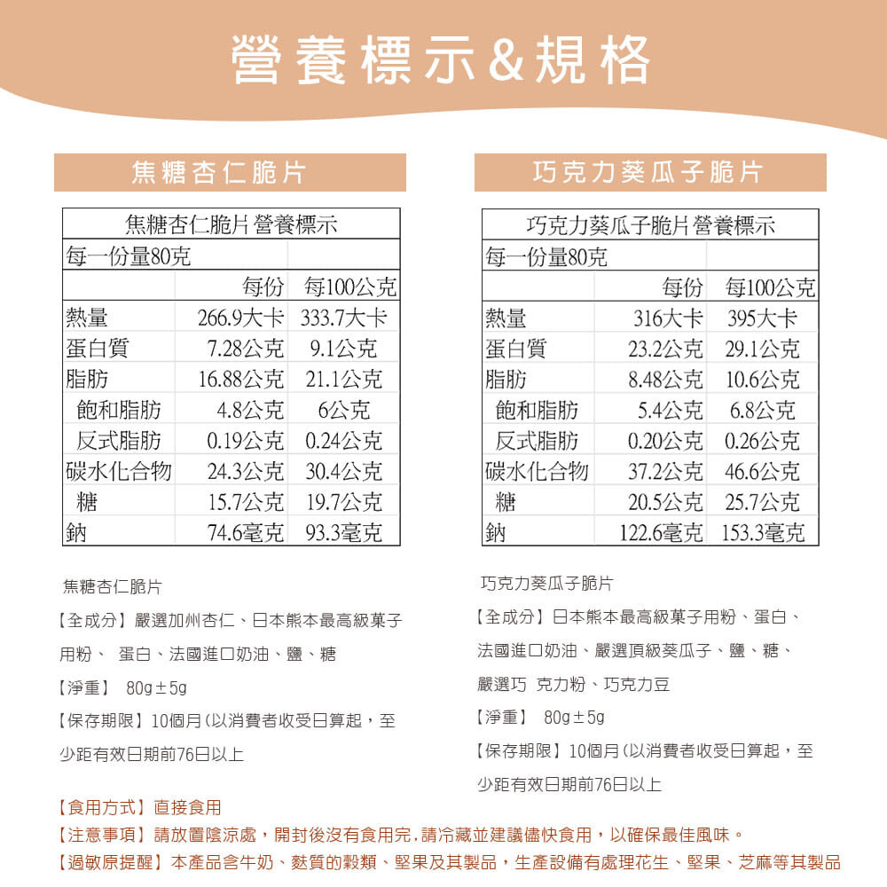 【過敏原提醒】本產品含牛奶、麩質的穀類、堅果及其製品,生產設備有處理花生、堅果、芝麻等其製品