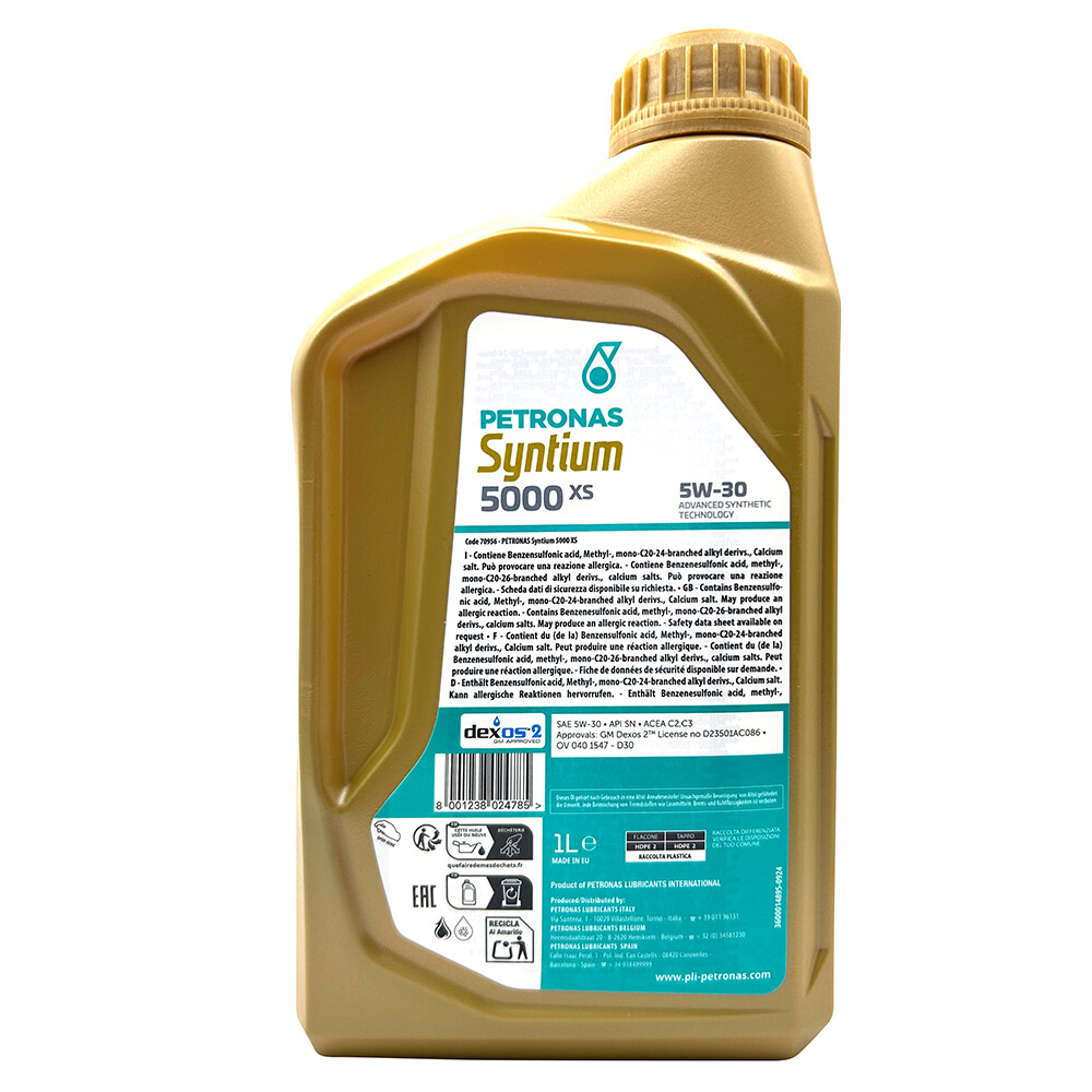 PETRONAS Syntium 5000 XS 5W-30 採用先進全合成配方與 CoolTech™ 技術,能有效控制因高溫引起的引擎損害,確保引擎在嚴苛駕駛環境中依然保持最佳性能。通過 API SN、ACEA C2/C3 認證,以及 GM dexos2® 認可,適用於多款歐系與日系汽車,包括搭載渦輪增壓與直噴引擎的車款。此機油可減少沉積物生成,延長引擎壽命,同時維持優異的燃油經濟性。