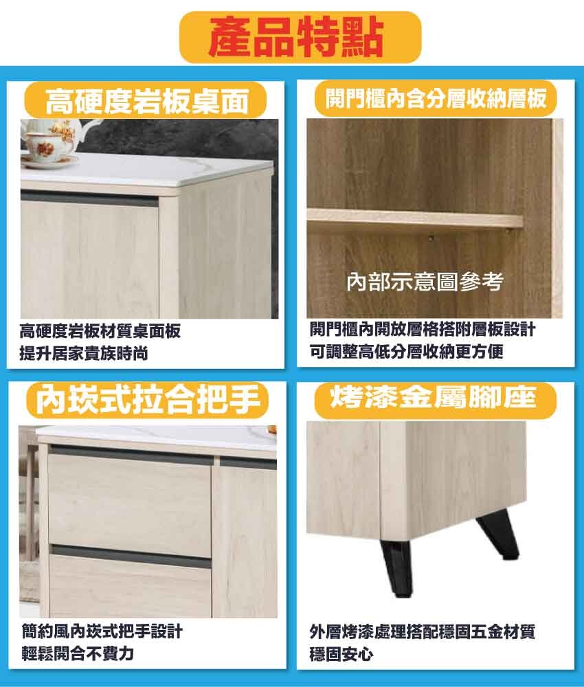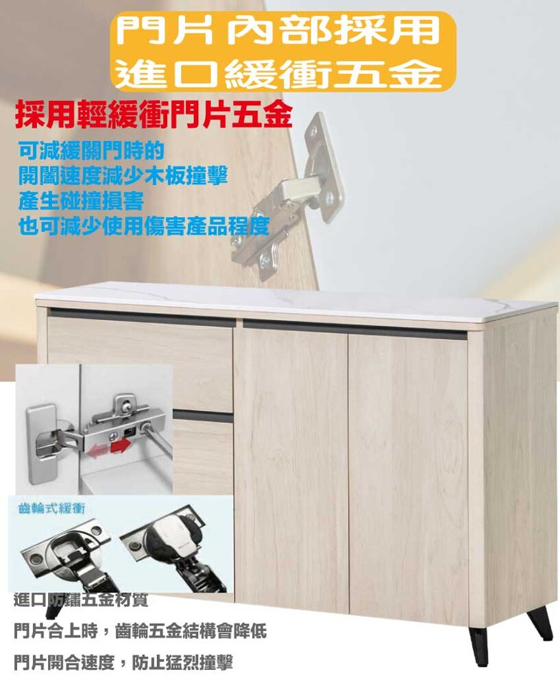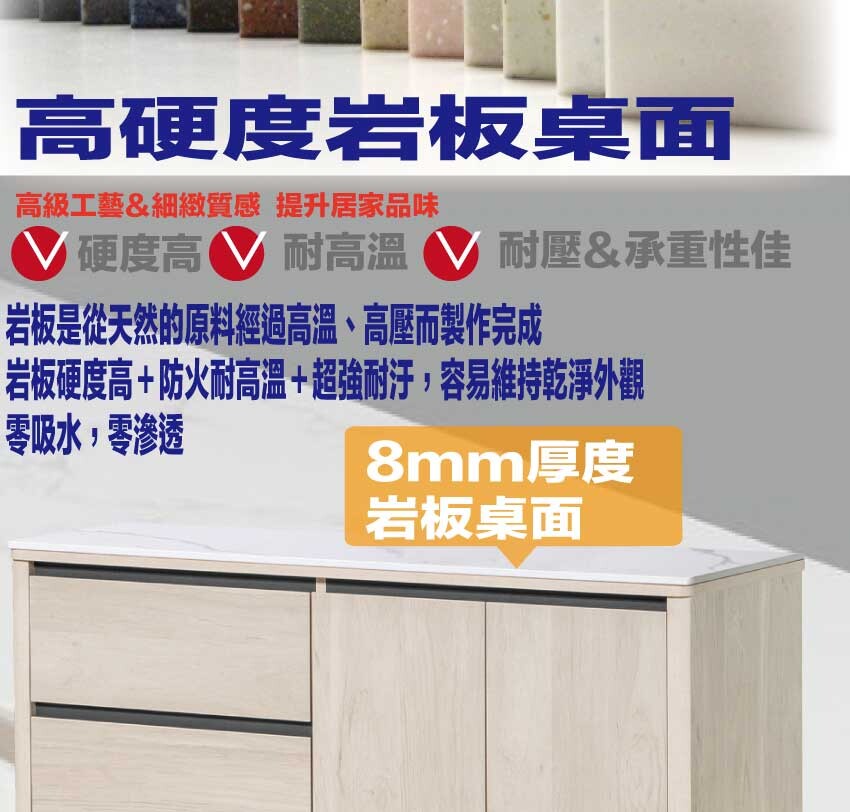 採用防蛀木心板+烤漆五金腳座+五金滑軌結構+8mm高硬度岩板桌面板+防夾手緩衝門片五金等安心材質製造