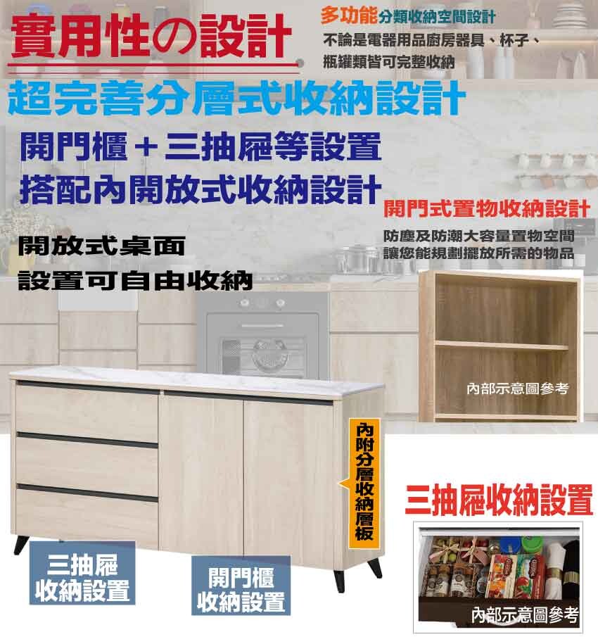 搭配採用開門櫃+三抽屜+內開放層格等收納空間設計