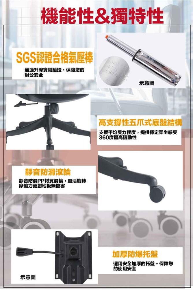 採用高剛性PP材質+高透氣強韌網布+五抓式底盤+防爆托盤架+高磅數氣壓棒+靜音防滑滾輪+高回彈性加厚泡棉等安心材質製造