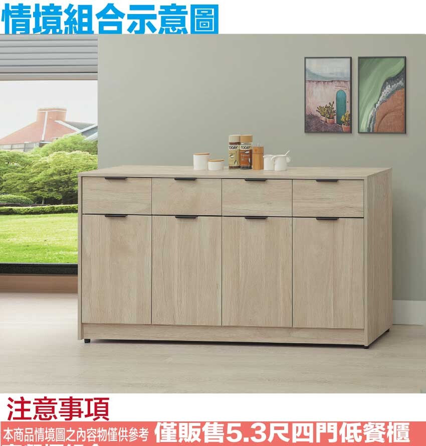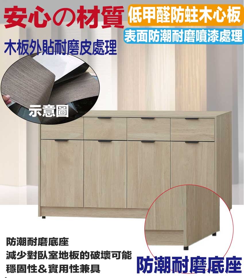 【綠家居】畢克爾5.3尺四門四抽低餐櫃 橡木紋色系+安心材質製造,使用放心+搭配居家更便利,採用防蛀木心板+防潮耐磨底座+防夾手緩衝門片五金+五金滑軌結構等安心材質製造 ,外層採用防潮耐磨噴漆處理搭配採用開門櫃+四抽屜+內開放層格等收納空間設計,全由專人配送到家,專業安心服務,替你省下更多時間!