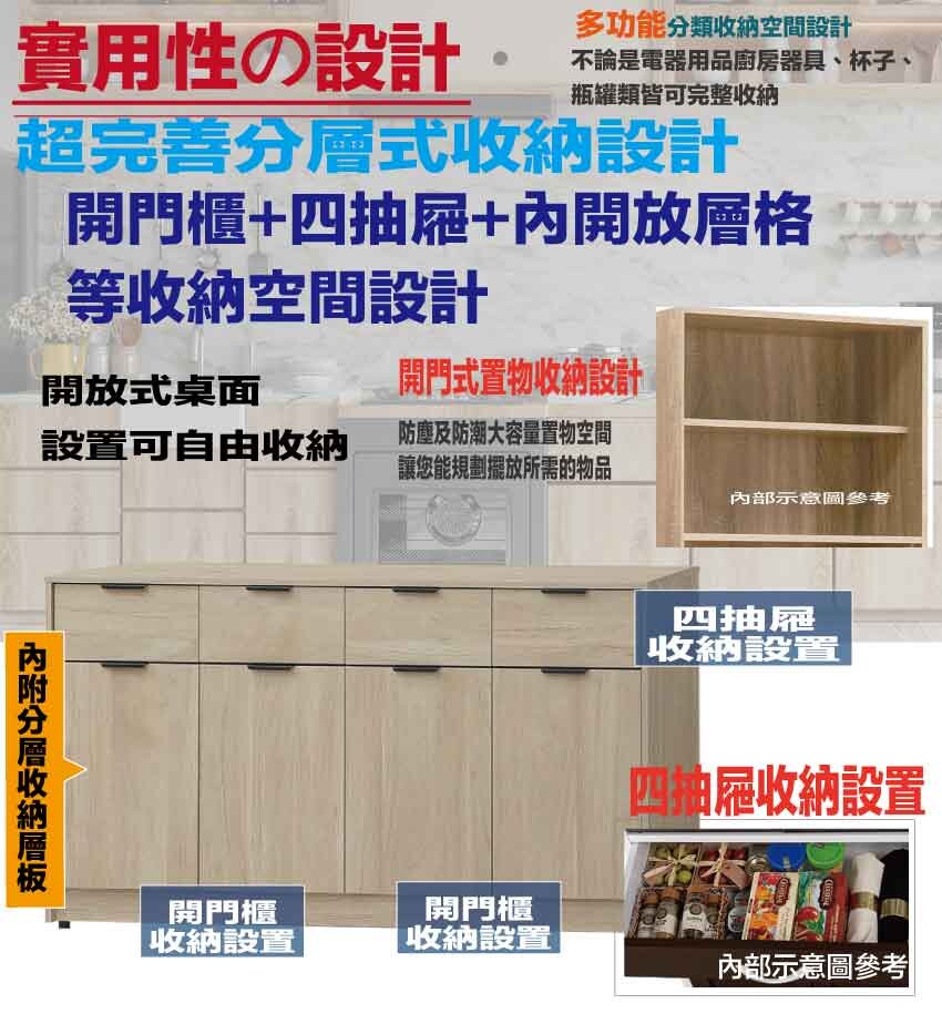 搭配採用開門櫃+四抽屜+內開放層格等收納空間設計