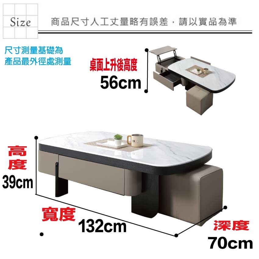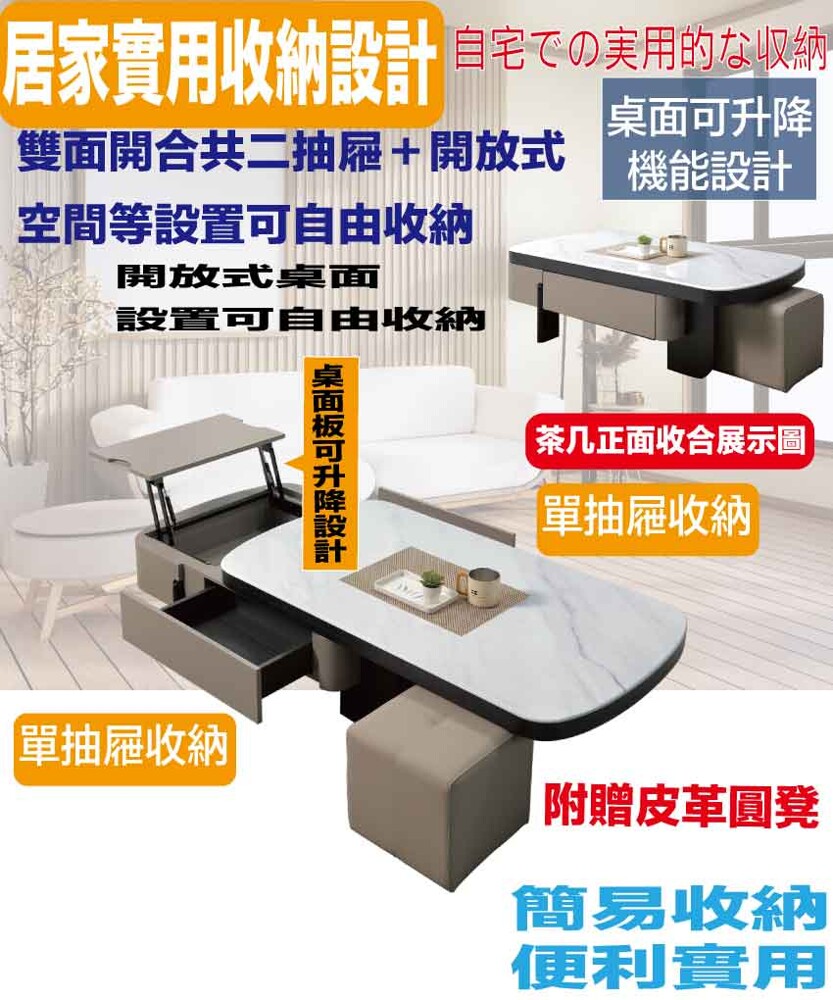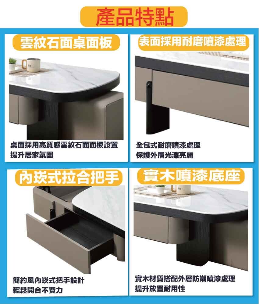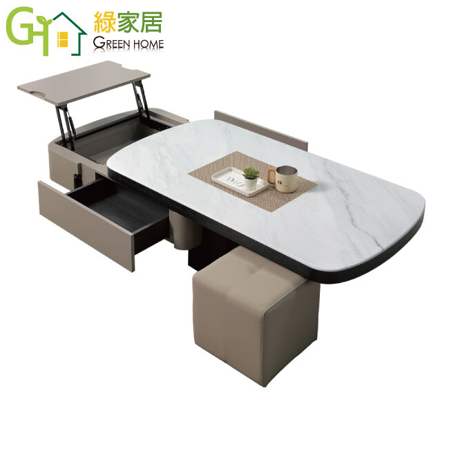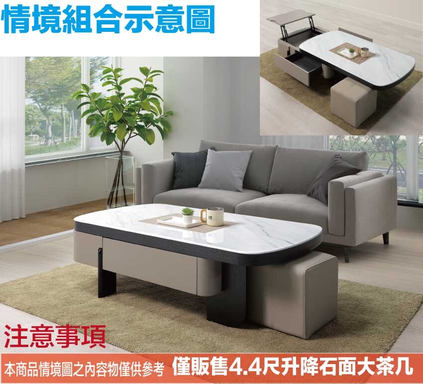 【綠家居】維可4.4尺雲紋石面升降大茶几(桌面可升降+附贈皮革圓凳單張) 現代雙色系+安心材質製造,使用放心+搭配居家更便利,採用防潮MDF板+實木噴漆腳座+五金滑軌結構+升降五金結構+12mm雲紋石面桌面板等安心材質製造 ,外層採用防潮耐磨噴漆處理搭配採用可升降桌面板(39-56cm)+雙面開合二抽屜+開放層格+附贈皮革圓凳單張等收納空間設計,全由專人配送到家,專業安心服務,替你省下更多時間!
