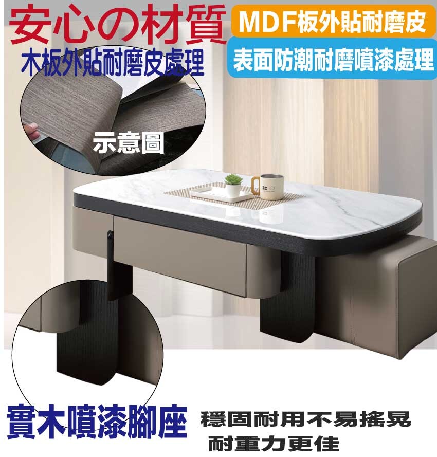 採用防潮MDF板+實木噴漆腳座+五金滑軌結構+升降五金結構+12mm雲紋石面桌面板等安心材質製造
