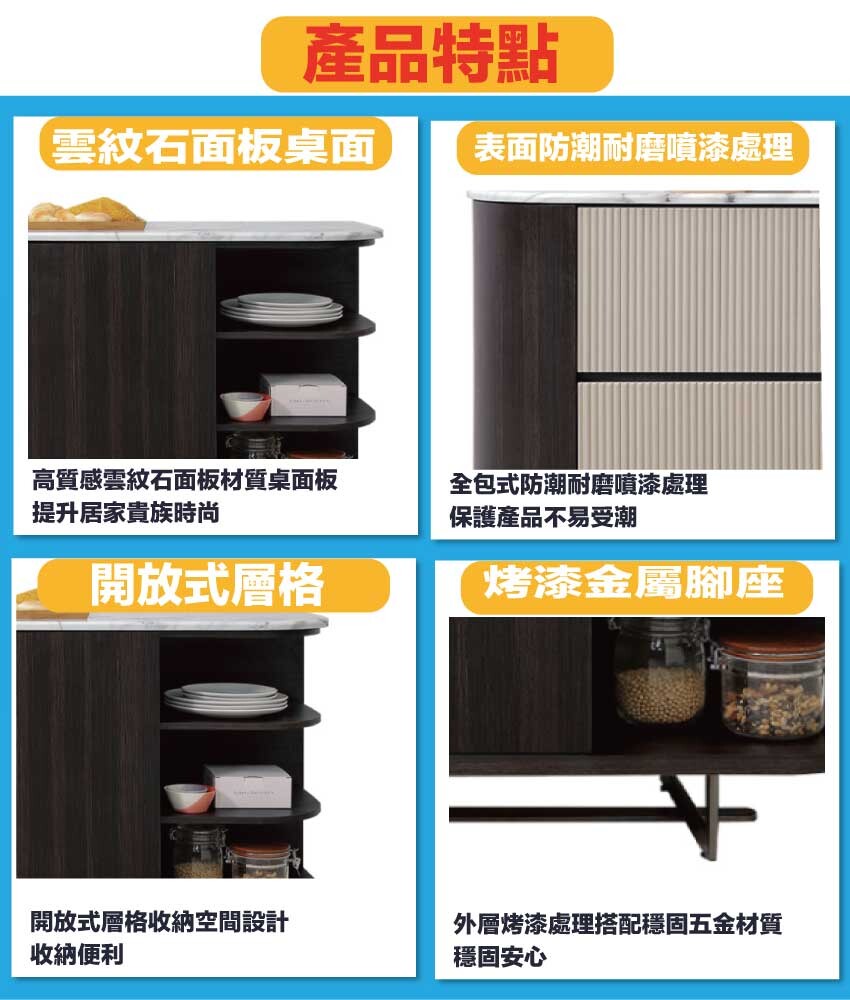 【綠家居】英格5.3尺雲紋石面二抽餐櫃 現代雙色系+安心材質製造,使用放心+搭配居家更便利,採用防潮MDF板+烤漆鐵製腳座+五金滑軌結構+20mm雲紋石面桌面板等安心材質製造 ,外層採用防潮耐磨噴漆處理搭配採用二抽屜+開放層格等收納空間設計,全由專人配送到家,專業安心服務,替你省下更多時間!
