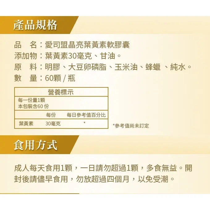 添加物:葉黃素30毫克、甘油。