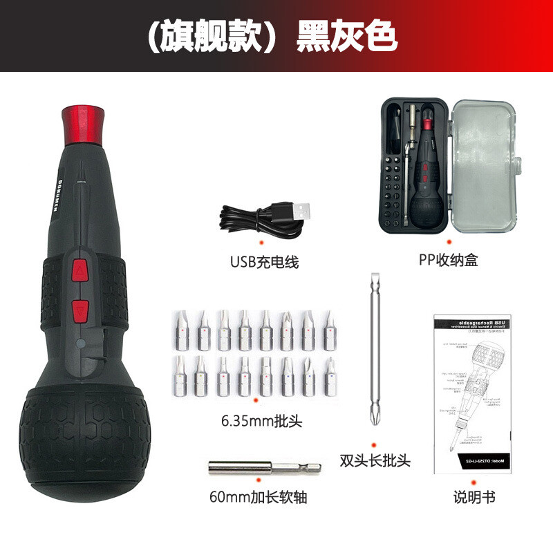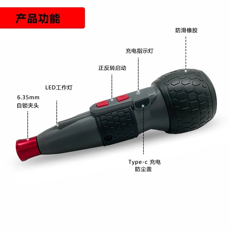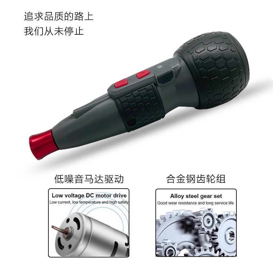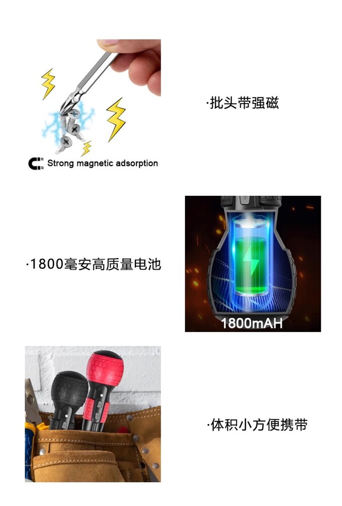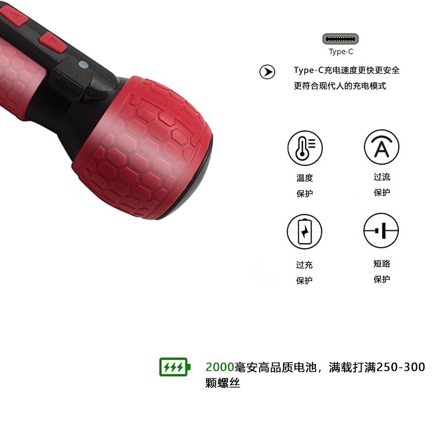 產品信息 電壓:3.6V DC 轉速:280Rpm/秒 電動最大扭矩:3N.m(實標) 手動最大扭矩:10N.m 電池:1800毫安锂電(足容) 充電口:Type-c(帶防塵蓋) 充電時間:1~1.5小時 續航:300顆螺絲