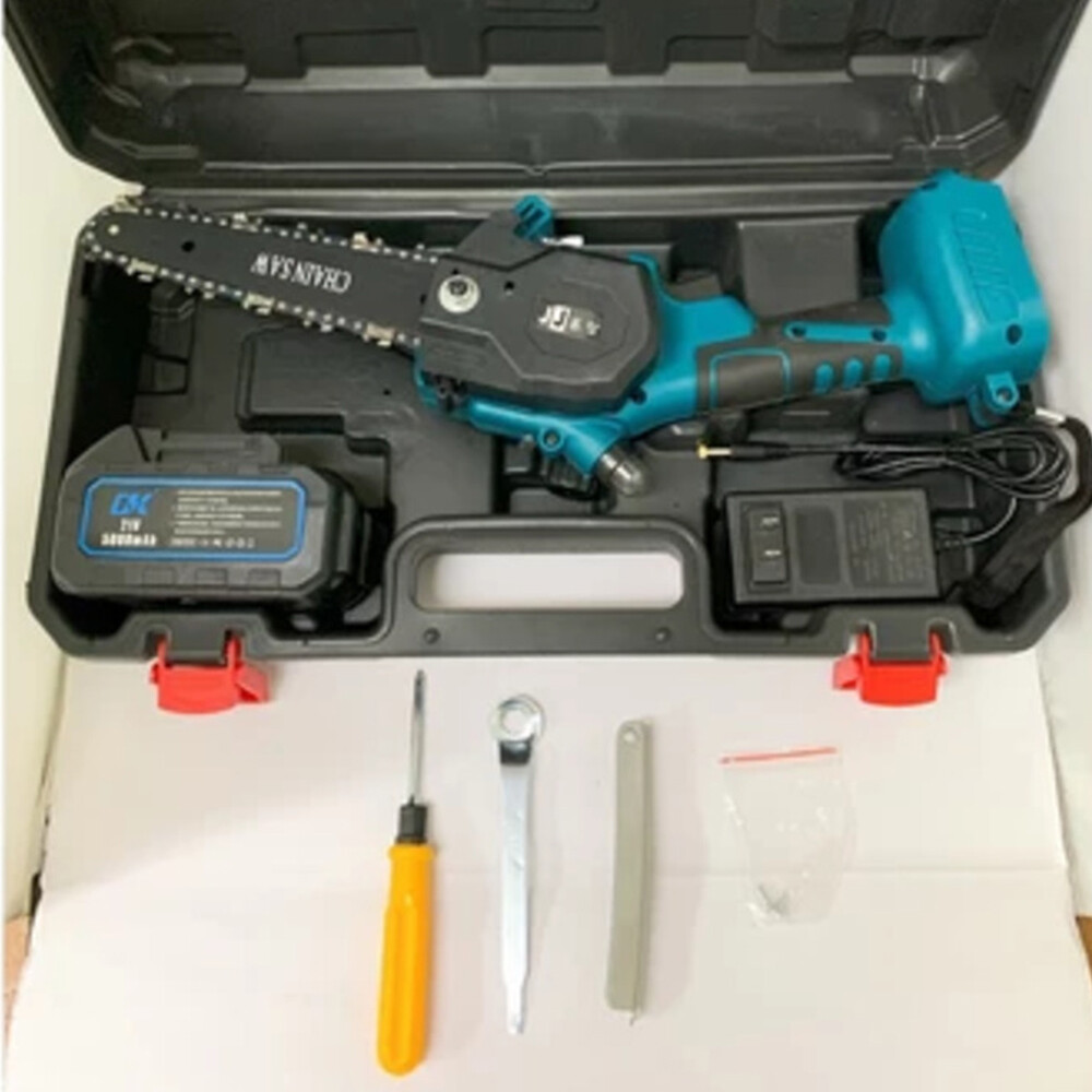 整套商品包含: 主機、電池、充電器、鏈條、導版、刀罩、螺絲扳手配件、塑膠工具盒。