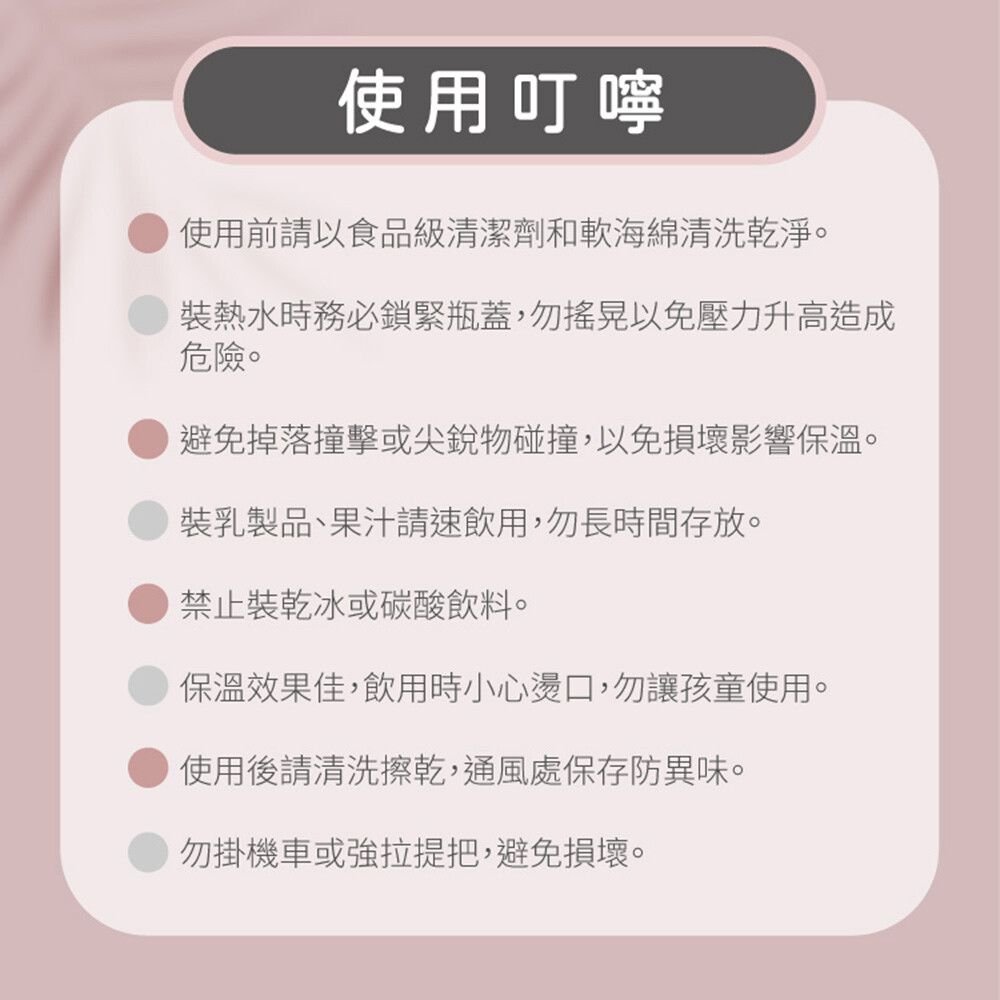 •商品保溫效果佳,直接飲用時請小心,避免直飲燙為防止異味、汙漬產生,使用後請務必清洗乾淨並瀝乾。