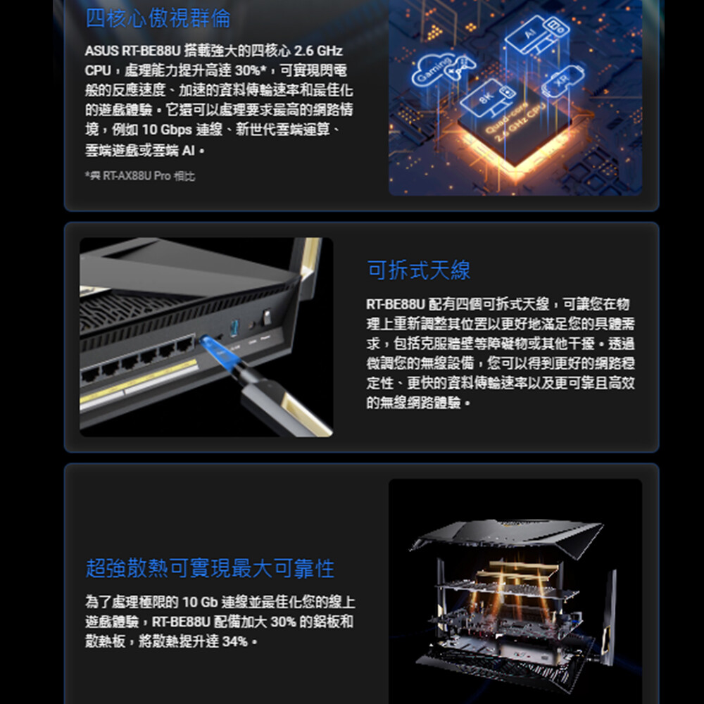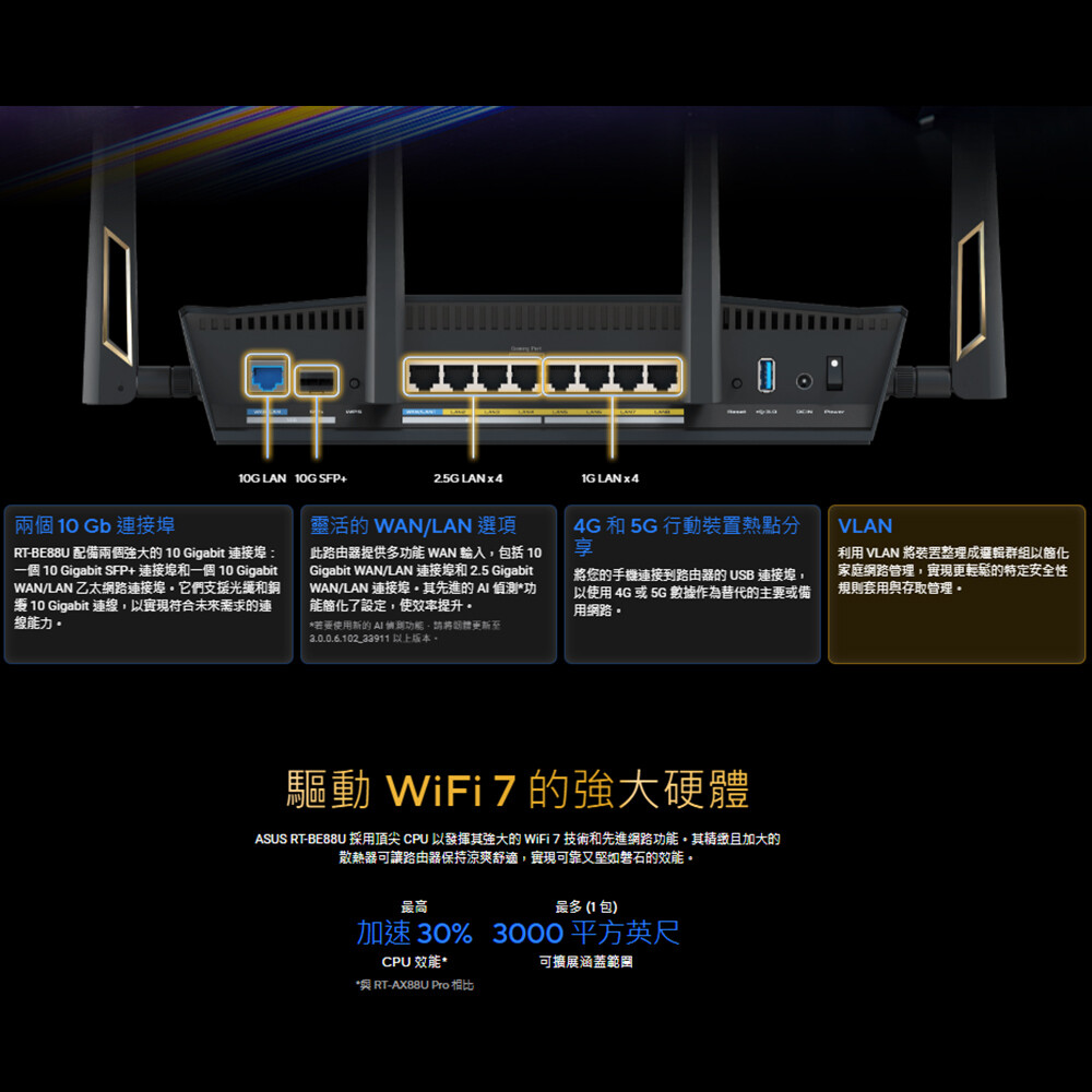 -4K-QAM、MLO、雙10G連接埠、SFP+、四組2.5G連接埠、四組1G連接埠、34G WAN/LAN容量、完全免費的高度網路安全防護、VPN。