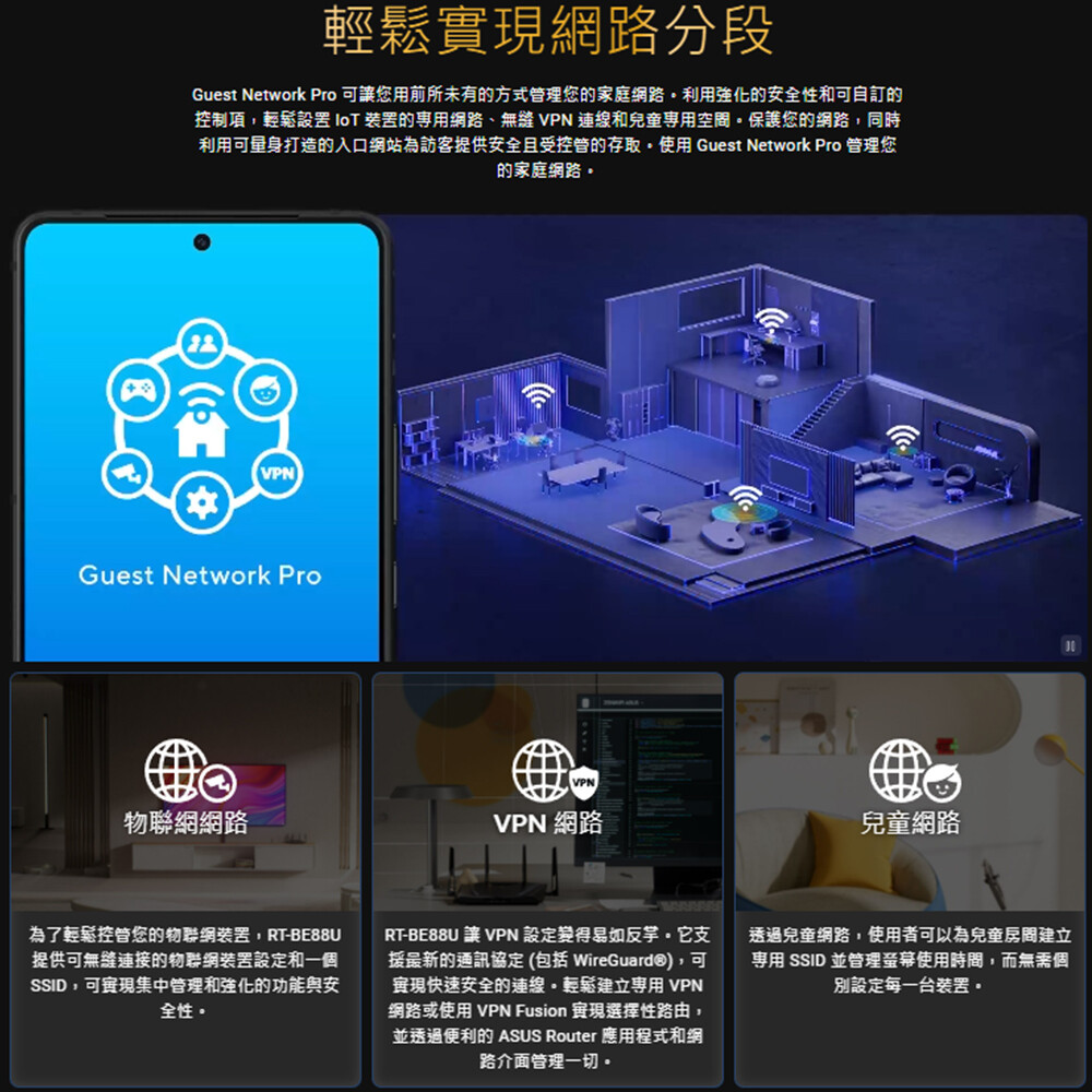 -使用Guest Network Pro輕鬆建立最多五個SSID,實現簡便的IoT裝置設定和管理、即時VPN連線以及便利的家長控制功能。