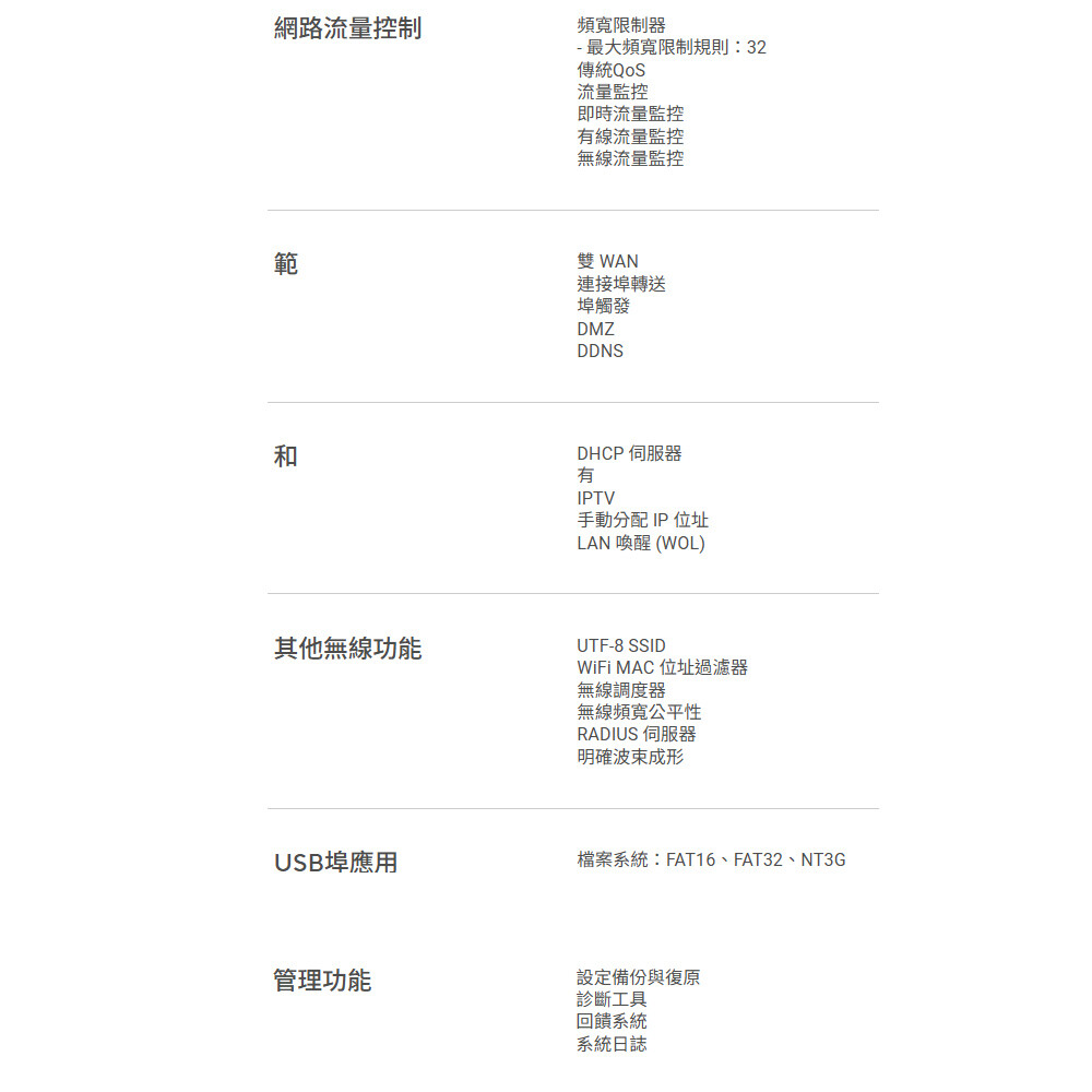 -四支外部天線提升覆蓋範圍和多裝置效能 : 2.4 GHz與5 GHz頻段各兩支天線。