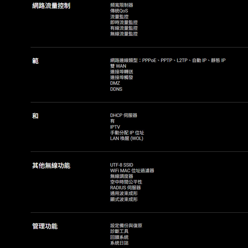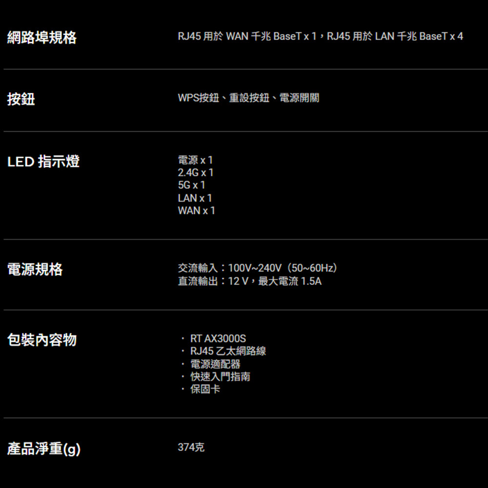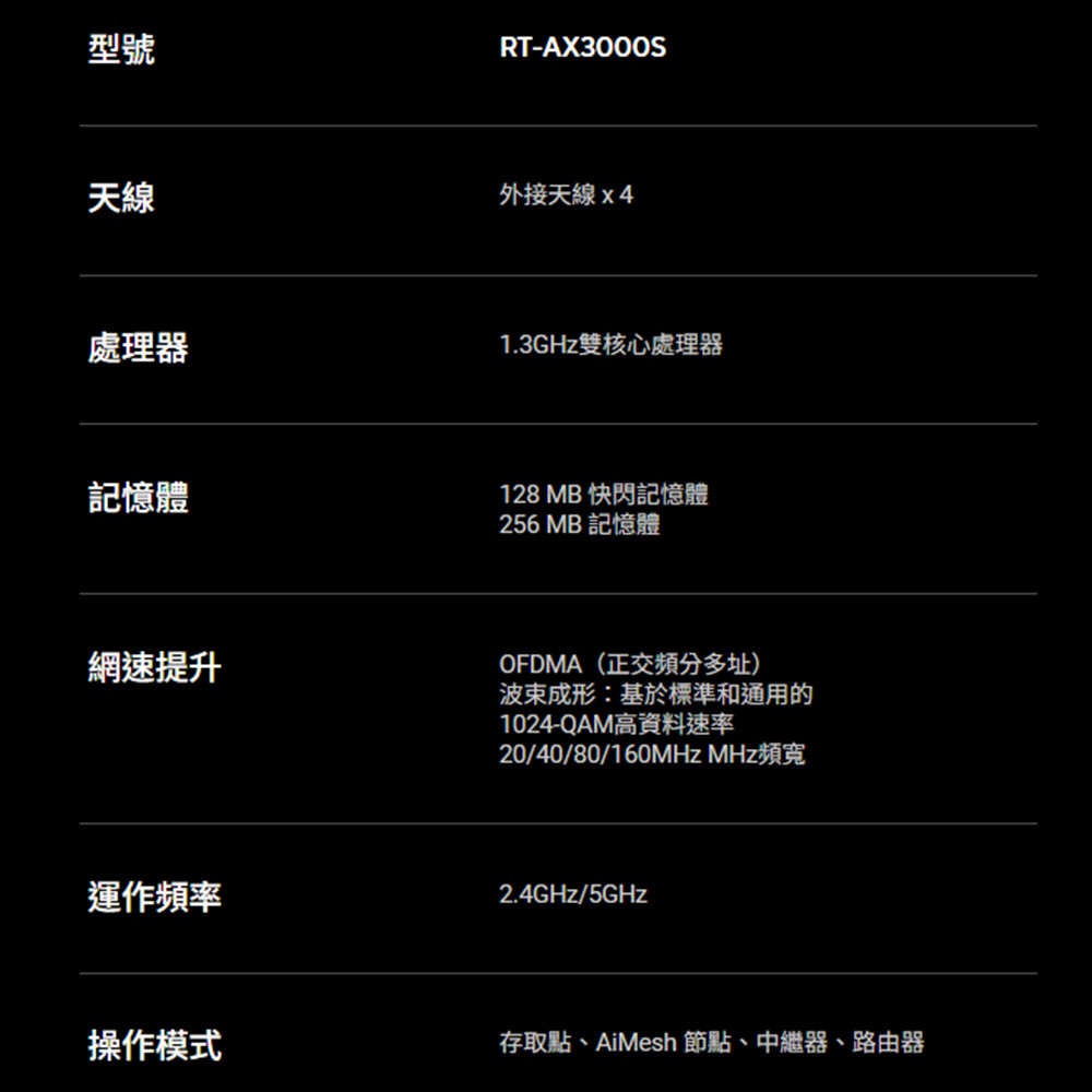-超快速WiFi速度 : RT-AX3000S支援1024-QAM,可實現更快的無線連接,總網路速度約為3000Mbps,2.4GHz頻段為574 Mbps,5GHz頻段為2402 Mbps。