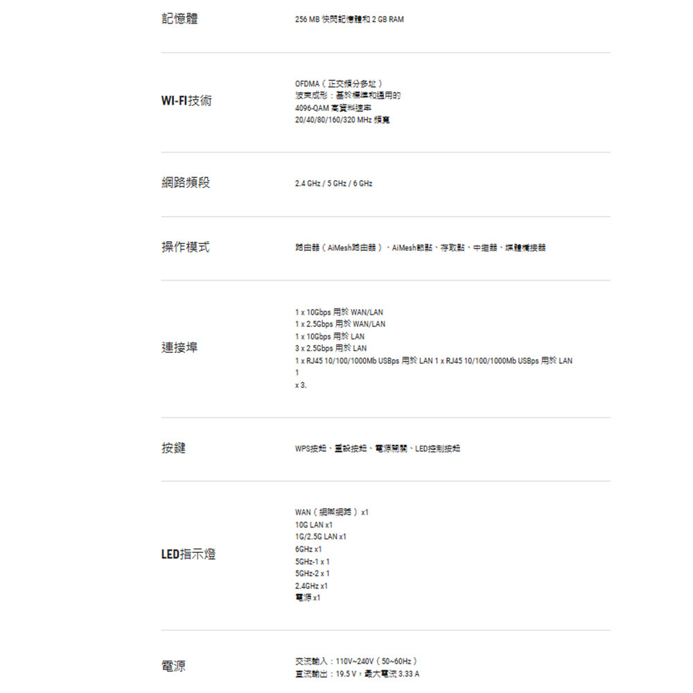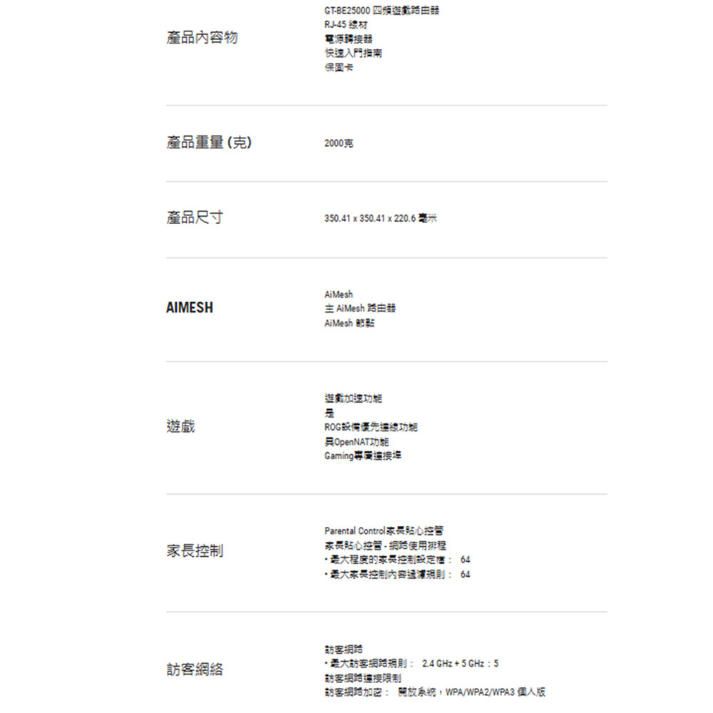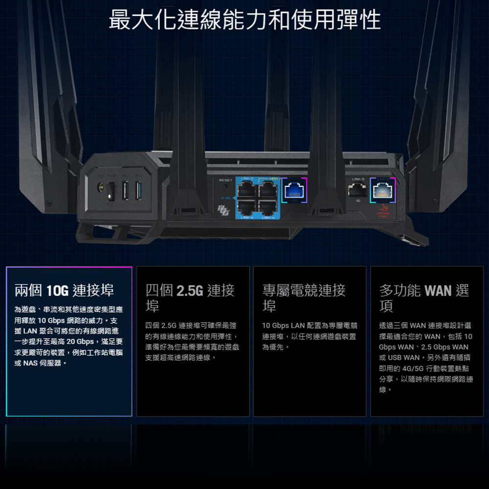 -四頻WiFi 7(802.11be)電競路由器,支援全新320MHz頻寬和4096-QAM、雙 10G連接埠、備用WAN、三層級遊戲加速、手機遊戲模式、AURA RGB、AiMesh支援、無需訂閱的網路安全性和全方位VPN功能。