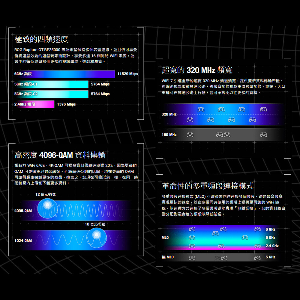-超高速WiFi 7 (802.11be)採用全新6 GHz頻段的320MHz通道及4096-QAM技術,顯著提升網路容量和傳輸量,最高速度可達25 Gbps。
