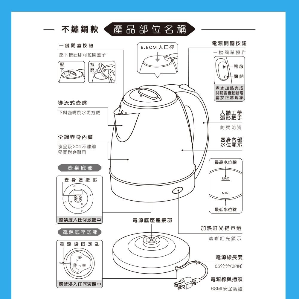 材 質:壺身#304不鏽鋼、外殼底座PP聚丙烯塑料