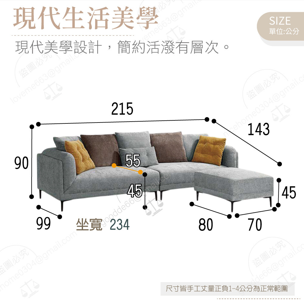 坐寬234公分 量至背枕處坐深55 坐高45公分