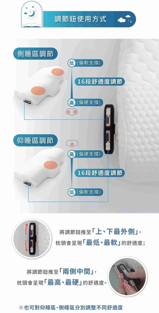 ◆ 分區調節 仰側睡兼顧16段軟硬舒適度