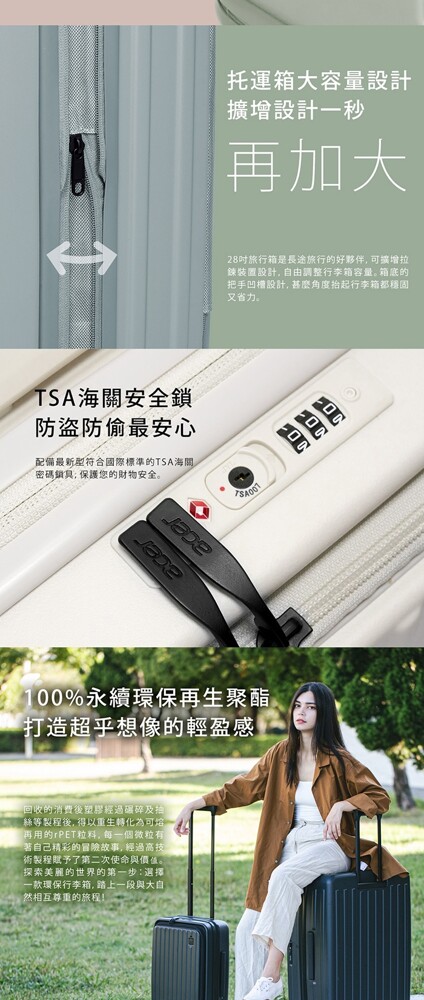 回收的消費後塑膠經過碾碎及抽絲等製程後,得以重生轉化為可熔再用的rPET粒料,每一個微粒有著自己精彩的冒險故事,經過高技術製程賦予了第二次使命與價值。探索美麗的世界的第一步:選擇一款環保行李箱,踏上一段與大自然相互尊重的旅程!