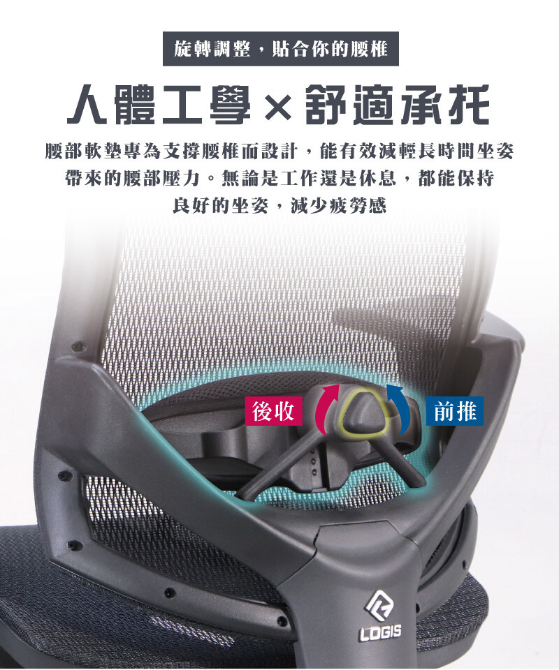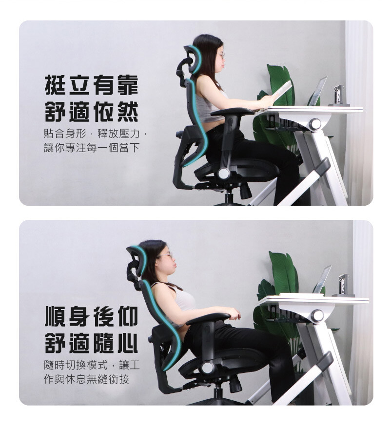 依照人體脊椎與坐姿角度打造,提供長時間坐姿支撐,減少身體疲勞。