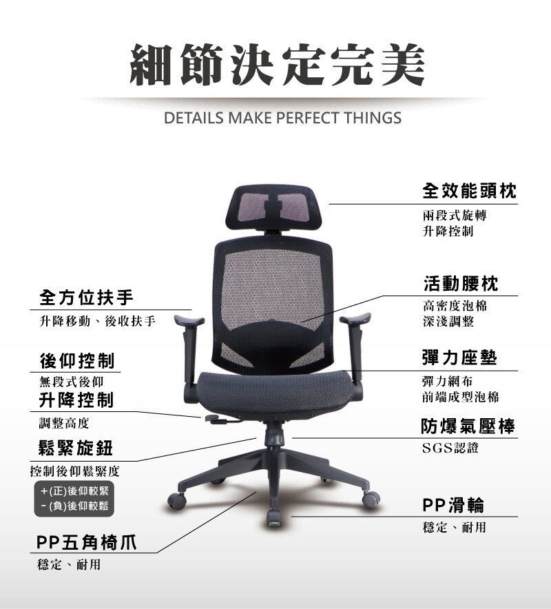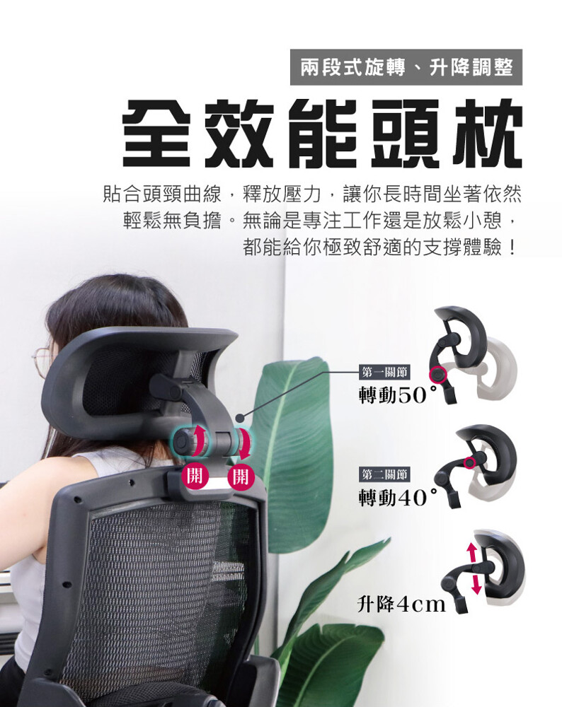 兩段式旋轉與上下調整,頭枕支撐頸椎,放鬆肩頸壓力,提升整體坐感舒適度。