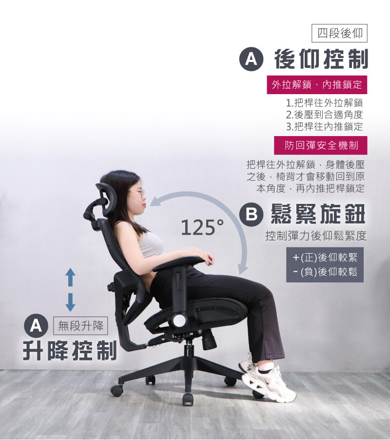 多段角度選擇(最大125°),穩固後仰不卡頓;防回彈系統確保安全回彈不突兀。