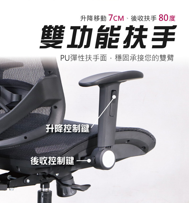 升降與後收自由調整,讓手臂自然擺放,維持最佳鍵盤輸入與閱讀姿勢,軟質PU彈性扶手面,穩固承接您的雙臂。
