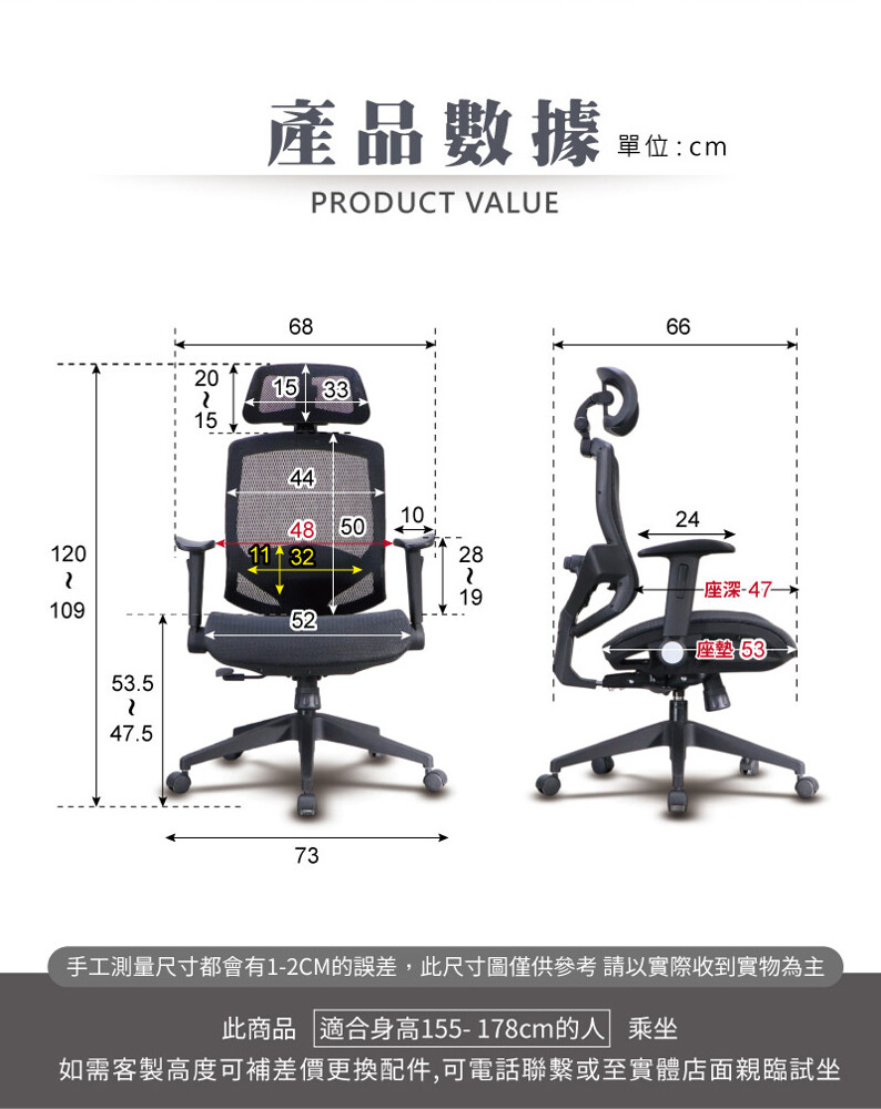 坐高47.5 ~ 53.5cm、坐寬52cm、座深47cm、座墊53cm