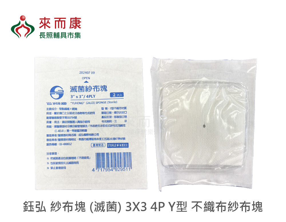 來而康 鈺弘 紗布塊 (滅菌) 3X3 4P Y型 不織布紗布塊 2入/包 2400包/箱 滅菌