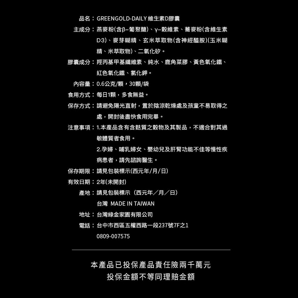 【GREEN GOLD】DAILY維生素D膠囊 (30顆/袋)