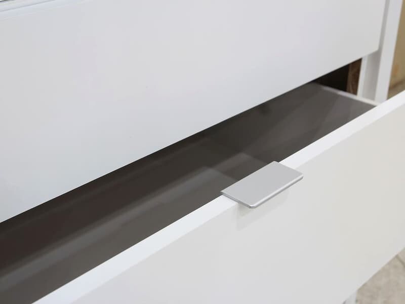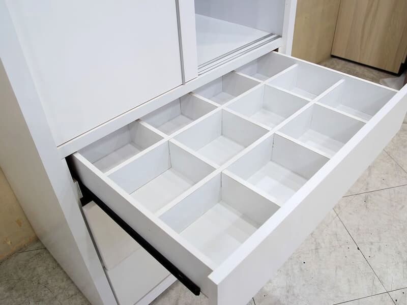 材質 | 板材 : 桶身 , 門板為木心板材質 塗裝 : 白色波麗漆塗裝 五金 : 門片上下鋁條軌道, 內建二抽及一組宮格抽採鋼珠滑軌, 鋁合金把手(僅二大抽有) |