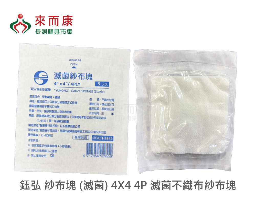 鈺弘 紗布塊 (滅菌) 4X4 4P 滅菌不織布紗布塊 3入/包 1000包/箱 滅菌 不織布 紗布