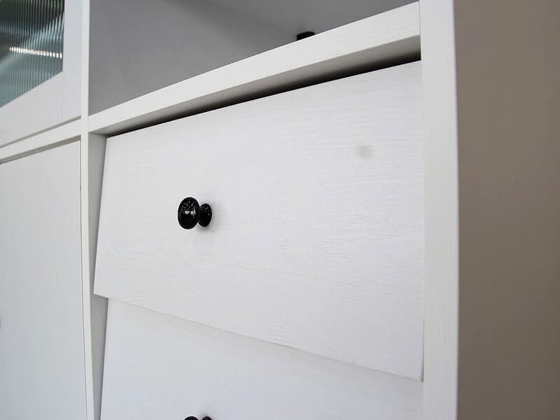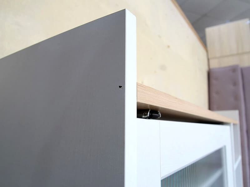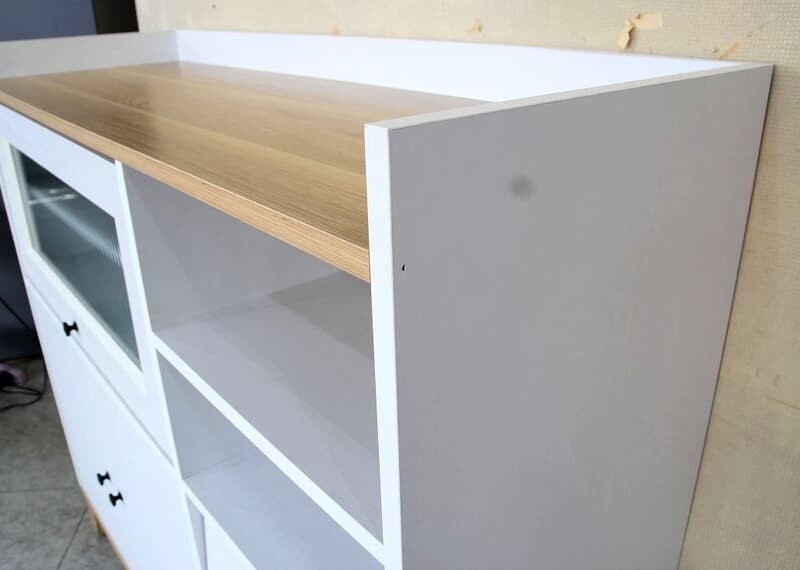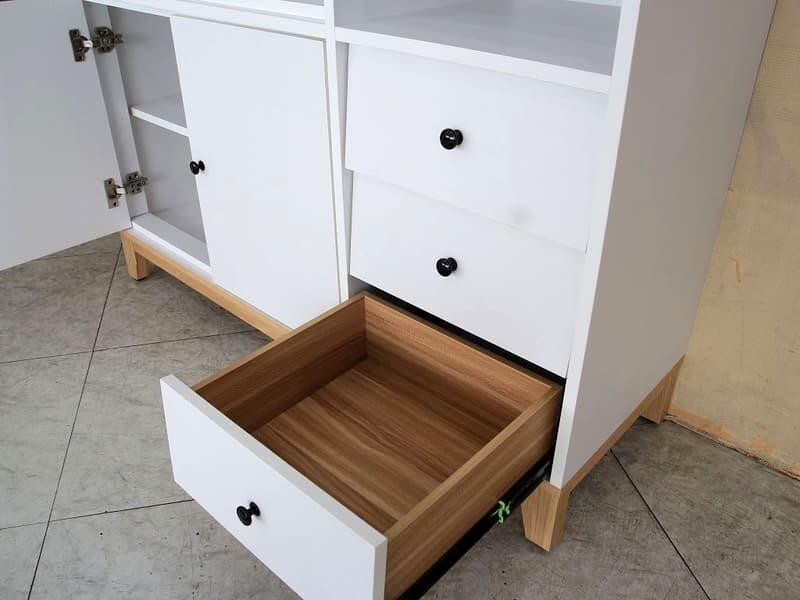 材質 | 板材 : 桶身,面板及門板為木心板材 , 堅固耐用 塗裝 : 木紋白色+楓木色耐刮耐磨木皮, 外部ABS封邊質感細緻 五金 : 內建三抽採吸入式鋼珠滑軌, 黑鐵把手, 上掀長虹玻璃門片 , 下木門 緩衝後紐 , 共附二片活動隔板 |
