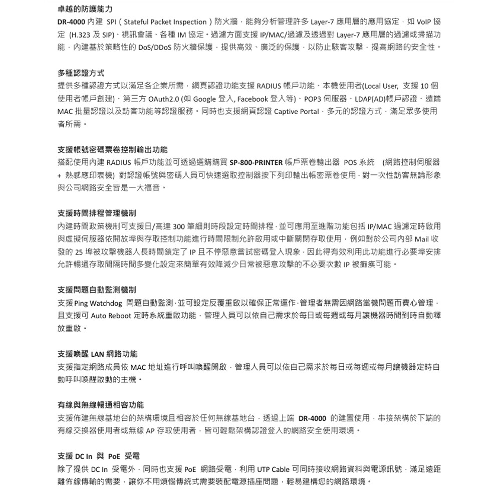 DR-4000內建 SPI(Stateful Packet Inspection)防火牆,能夠分析管理許多Layer-7應用層的應用協定,如VoIP協定 (H.323及SIP)、視訊會議、各種IM協定。過濾方面支援IP/MAC/過濾及透過對Layer-7應用層的過濾或掃描功能,內建基於策略性的DoS/DDoS防火牆保護,提供高效、廣泛的保護,以防止駭客攻擊,提高網路的安全性。