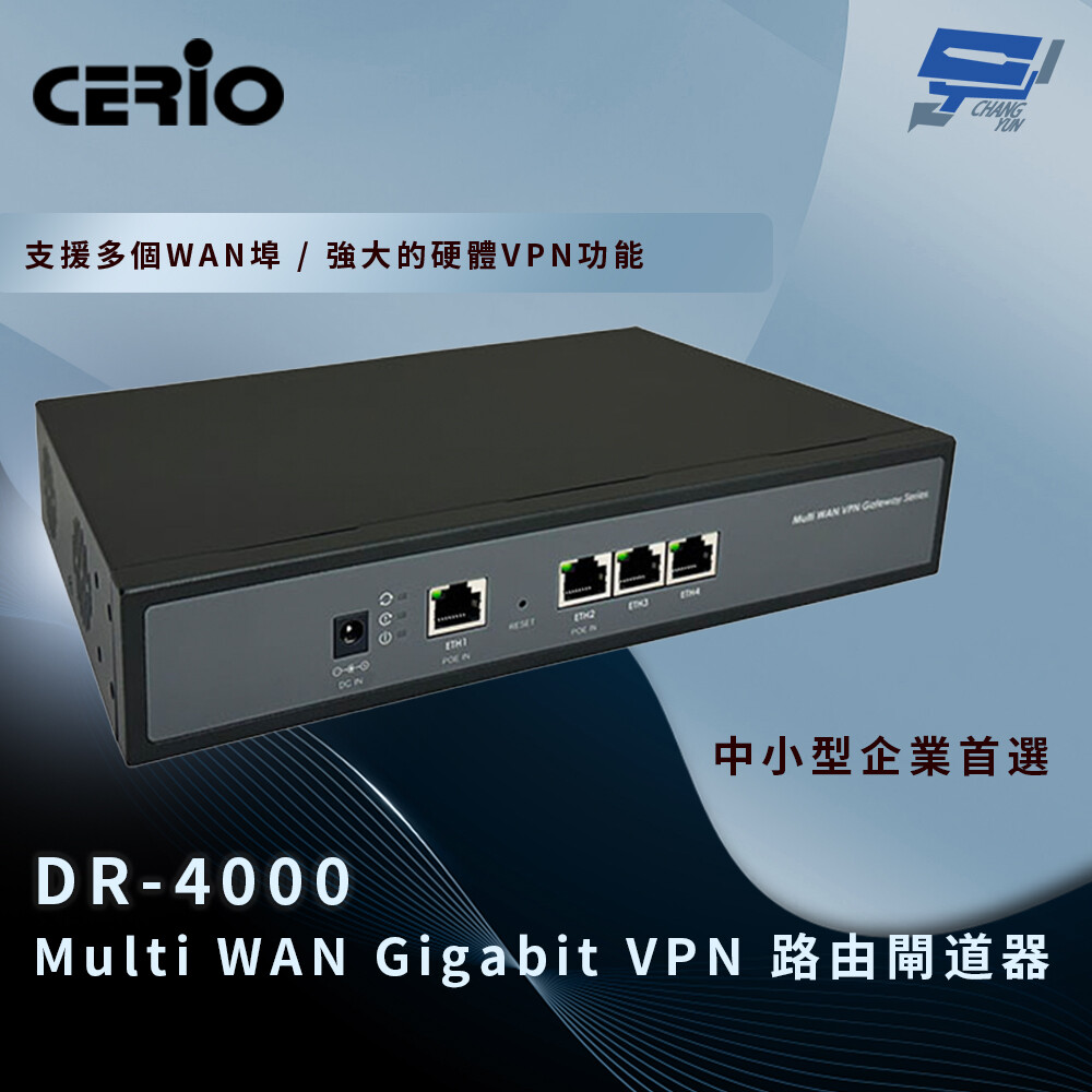 CERIO DR-4000 多功能VPN路由閘道器是一款易於使用、高靈活度且極高性能的硬體VPN設備,為存取及交換敏感機密資料提供完整的資料安全和隱私,支援多種VPN包括 IPSec、PPTP、L2TP over IPSec、VPN P2P、透過網站過濾功能,可以為中小型辦公室、分公司及遠端員工提供更安全、更靈活、更強大的網路連結。非常適合佈署在中小型企業的網路環境。