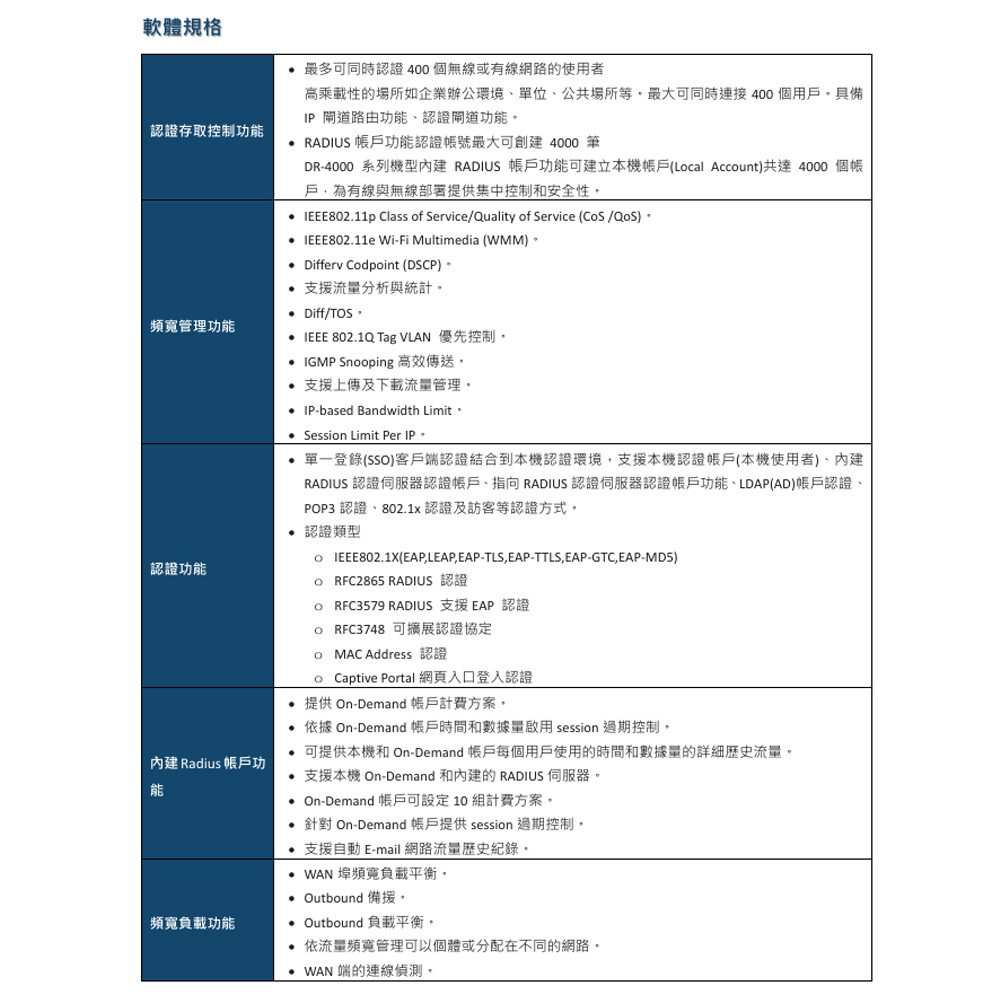 提供多種認證方式以滿足各企業所需,網頁認證功能支援RADIUS帳戶功能、本機使用者(Local User, 支援10個使用者帳戶創建)、第三方OAuth2.0 (如Google登入, Facebook登入等)、POP3伺服器、LDAP(AD)帳戶認證、遠端MAC批量認證以及訪客功能等認證服務。同時也支援網頁認證Captive Portal,多元的認證方式,滿足眾多使用者所需。
