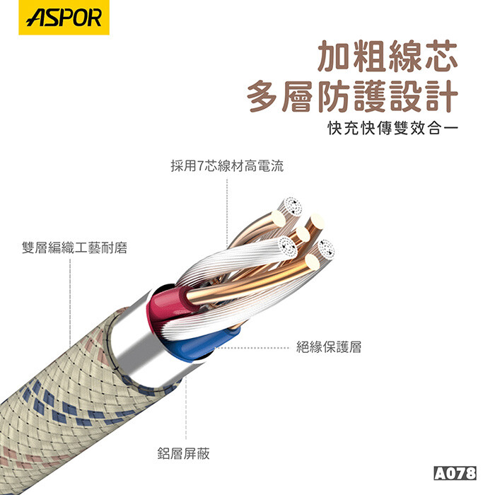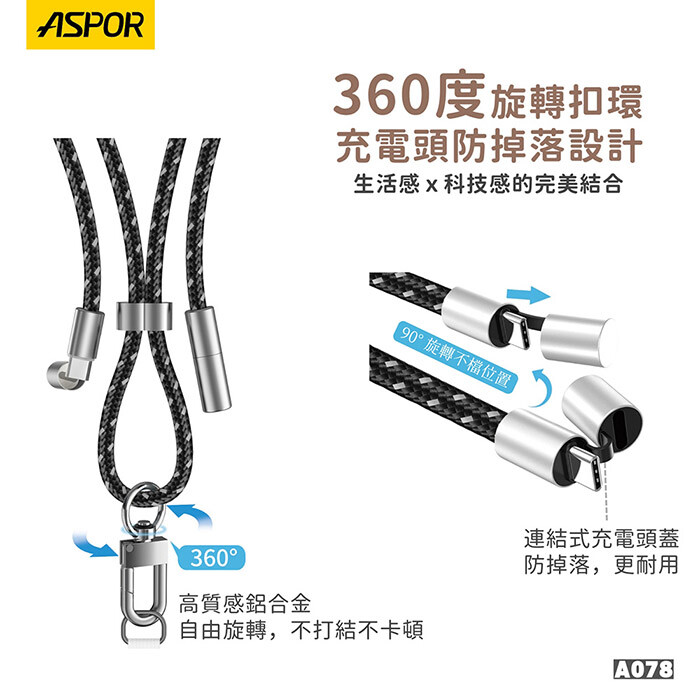 ASPOR 100W快充 防丟編織掛繩 USB-C to USB-C 傳輸充電線 附墊片(180cm)
